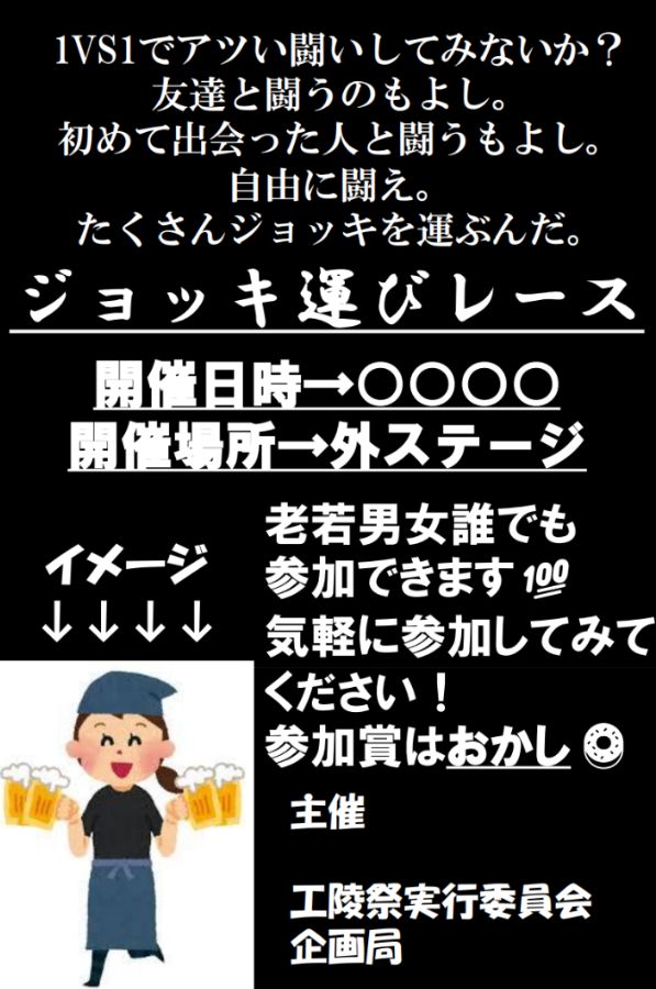 こんにちは!2年建築学科です。私たちは昨年に引き続き縁日をやっています!ぜひ建築学科棟1階まで足を運んでください!