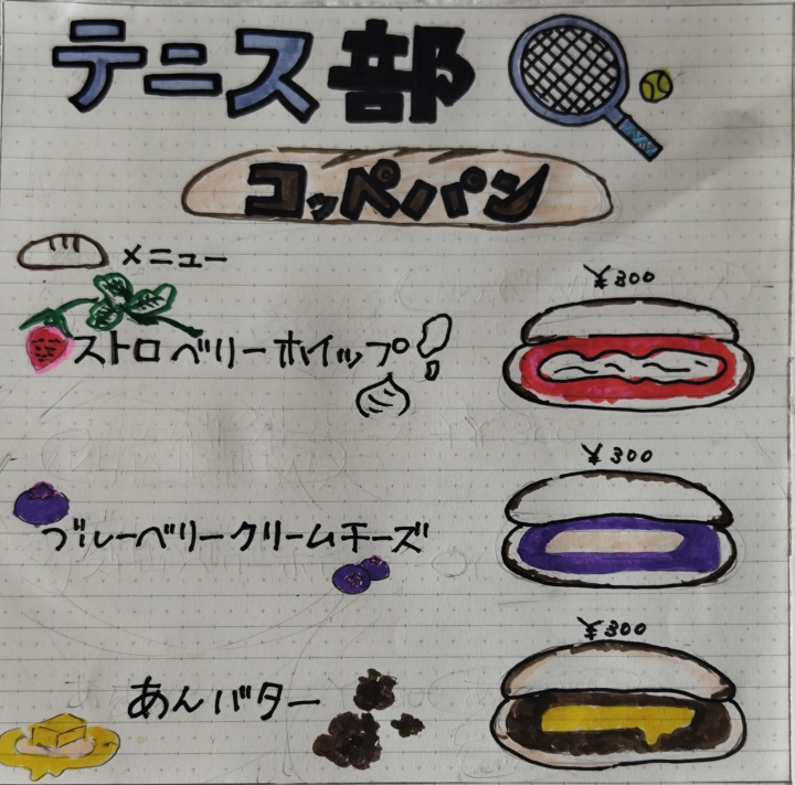 ソフトテニス部です!ストロベリーホイップ、ブルーベリー、あんバターの3種類の「コッペパン」を販売します。ぜひぜひ!買いに来てくださーい!